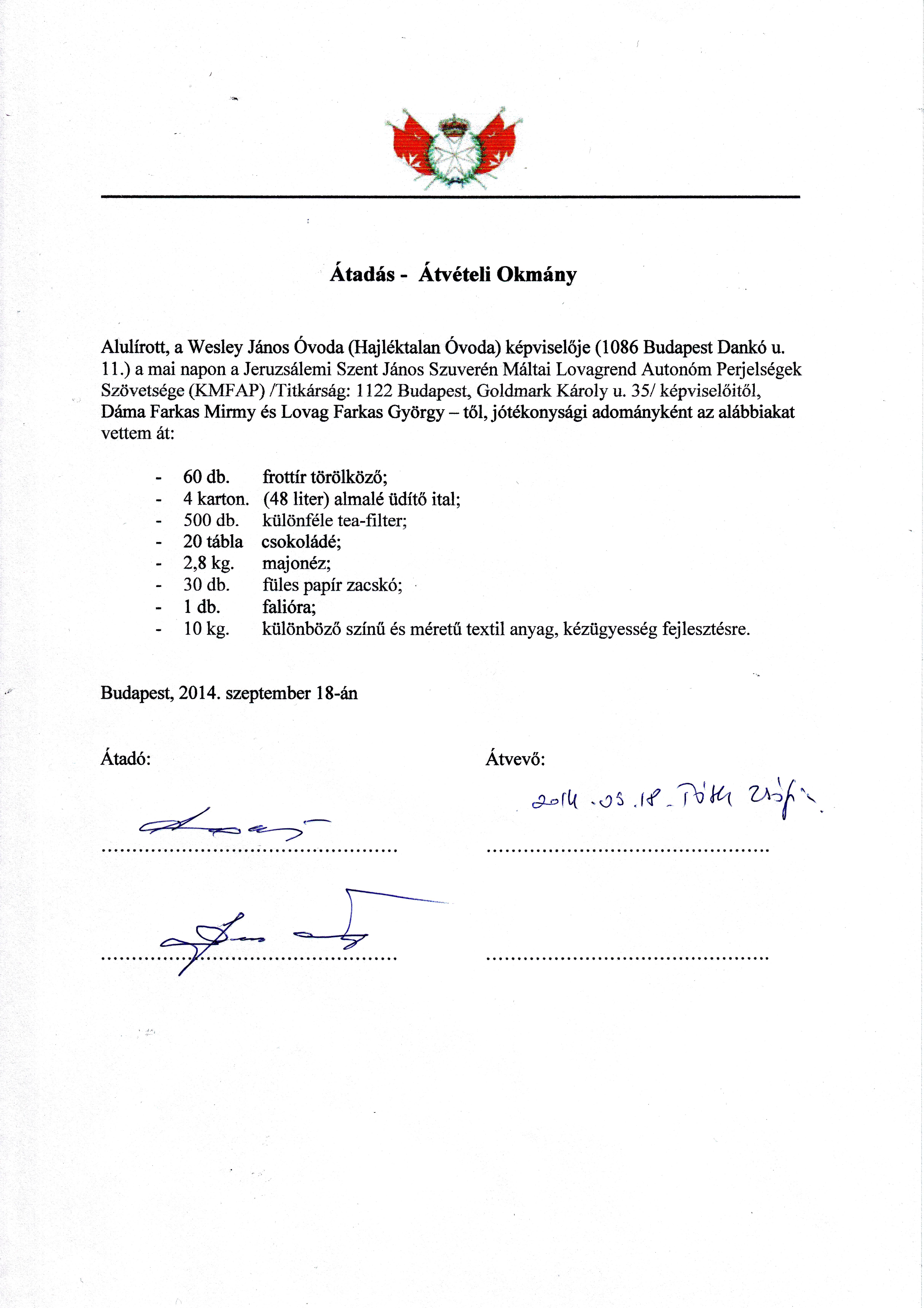 Mielőtt bevásároltunk volna, Farkas Mirmy a FEMERAID (a Máltai Lovagrend humanitárius szervezete) tisztségviselője megtudakolta, mire lenne aktuálisan szüksége az intézménynek. Ennek megfelelően – a lista szerint – több tucat törölköző, üdítőitalok, élelmiszerek kerültek a csomagba, amelyet az Óvoda vezetőjének adtak át a Jeruzsálemi Szent János Szuverén Máltai Lovagrend Autonóm Perjelségek Szövetsége (KMFAP) képviseletében a FEMERAID tisztségviselői.
