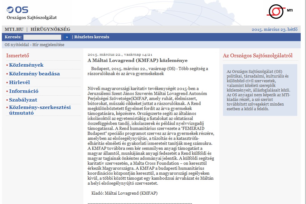 Budapest, 2015. március 22., vasárnap (OS) - Több segítség a rászorulóknak és az árva gyermekeknek Növeli magyarországi karitatív tevékenységét 2015-ben a Jeruzsálemi Szent János Szuverén Máltai Lovagrend Autonóm Perjelségei Szövetsége(KMFAP, amely ruhát, élelmiszert, bútorokat, műszaki cikkeket juttat a rászorulóknak. A Rend megkülönböztetett figyelmet fordít az árva gyermekek támogatására, képzésére. Országszerte segíti az általános iskolásoktól az egyetemistákig a fiatalokat az oktatással összefüggésben tandíj, iskolaszerek és például nyelvvizsgadíj támogatással. A Rend humanitárius szervezete a "FEMERAID Budapest" speciális programot szervez az árva gyermekek részére, amelyben az elsősegélynyújtás, a tűzoltás és a katasztrófa-elhárítás elméleti és gyakorlati ismereteit tanítják meg számukra. A KMFAP továbbra sem kér semmilyen anyagi támogatást a magyar államtól, munkájának anyagi fedezetét a Rend külföldi és magyar tagjainak önkéntes adományai jelentik. A külföldi segítség karitatív szervezetén, a Malta Cross Foundation – on keresztül érkezik Magyarországra. A KMFAP a budapesti humanitárius koordinációs központján keresztül, a magyarországi segélyeken kívül, a többi között támogat egy kambodzsai árvaházat és Máltán a helyi elsősegélynyújtó szervezetet.
