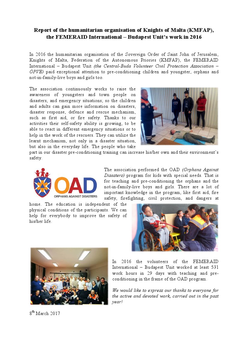 In 2016 the humanitarian organisation of the Sovereign Order of Saint John of Jerusalem, Knights of Malta, Federation of the Autonomous Priories (KMFAP), the FEMERAID International – Budapest Unit (the Central-Buda Volunteer Civil Protection Association – ÖPVE) paid exceptional attention to pre-conditioning children and youngster, orphans and not-in-family-live boys and girls too.