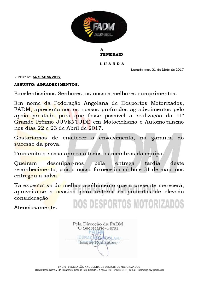 In another letter the FADM is asking the support of FEMERAID Angola - by sending them one of our inflatable hospitals and our ambulance of Advanced Life Support, as well as our medical crew to the forthcoming races of karting and motorcycles, taking place between 10-11 June 2017.