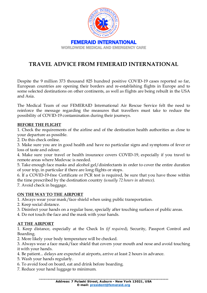 The Medical Team of our FEMERAID International Air Rescue Service felt the need to reinforce the message regarding the measures that travellers must take to reduce the possibility of COVID-19 contamination during their journeys...