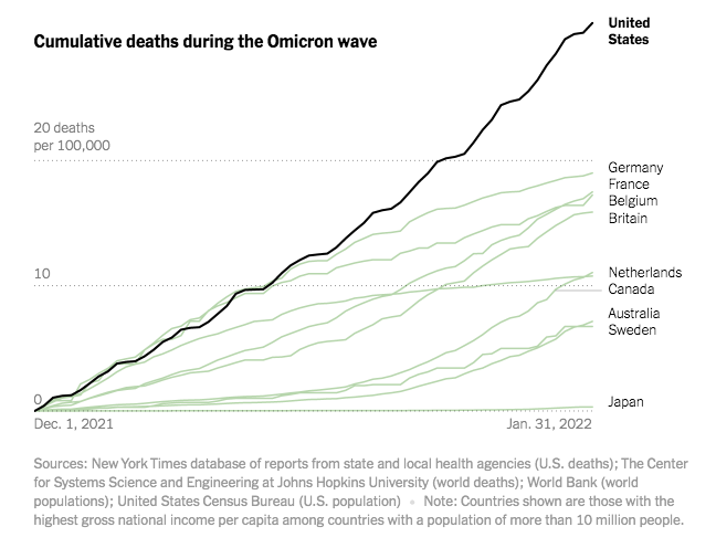 The main reason for this discrepancy is the current vaccination rate in the USA. Despite having one of the world's best access to vaccines, the US has failed to vaccinate as many people as other large, wealthy nations, and has fallen even further behind in administering booster shots, leaving large numbers of vulnerable people with fading protection as Omicron sweeps across the country.