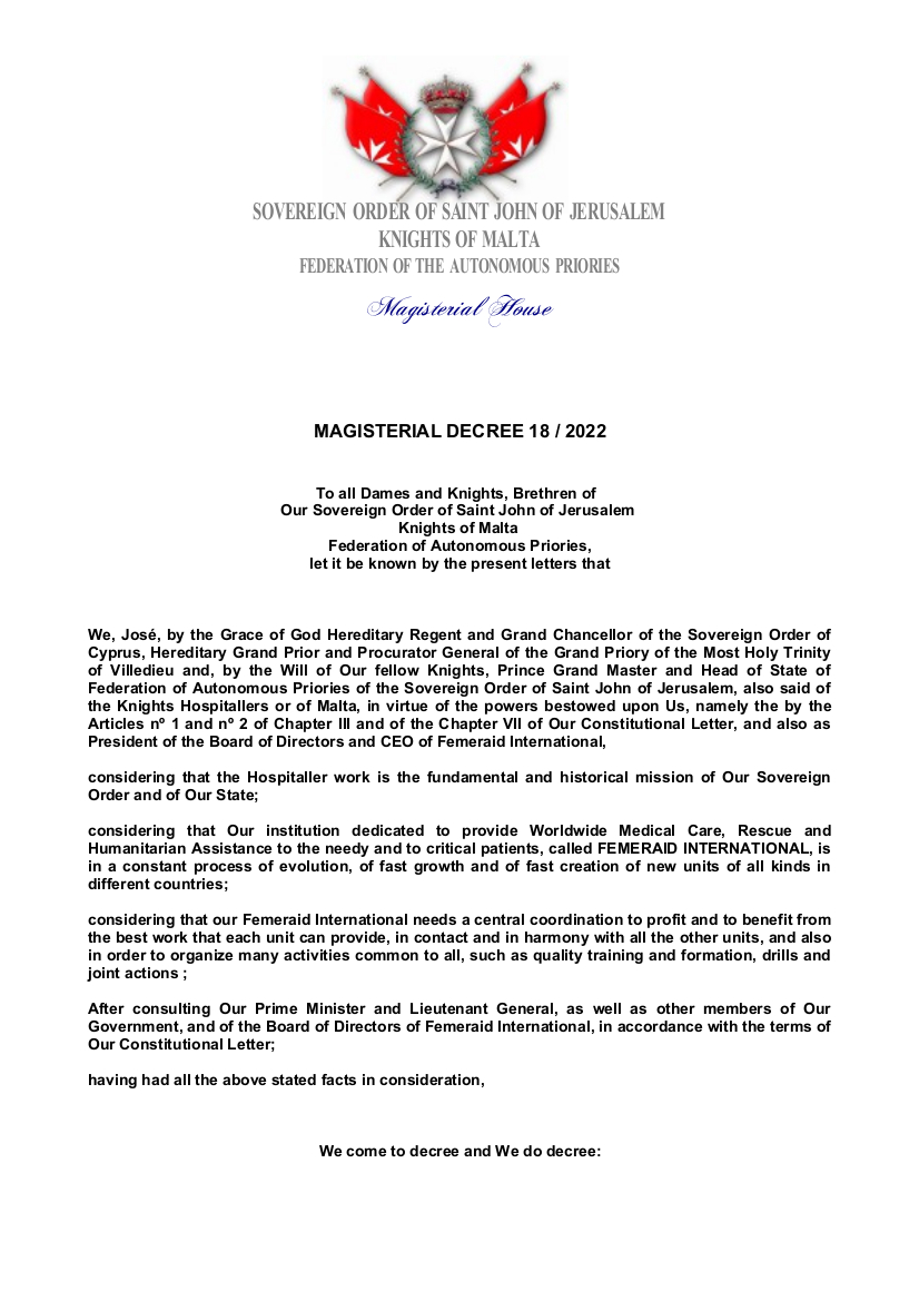 The Magisterial House of KMFAP and the Board of Directors of FEMERAID International will be grateful to all Knights, Dames, FEMERAID Units and Representatives, as well as to other external entities, for any support and assistance given to the new Secretary General.