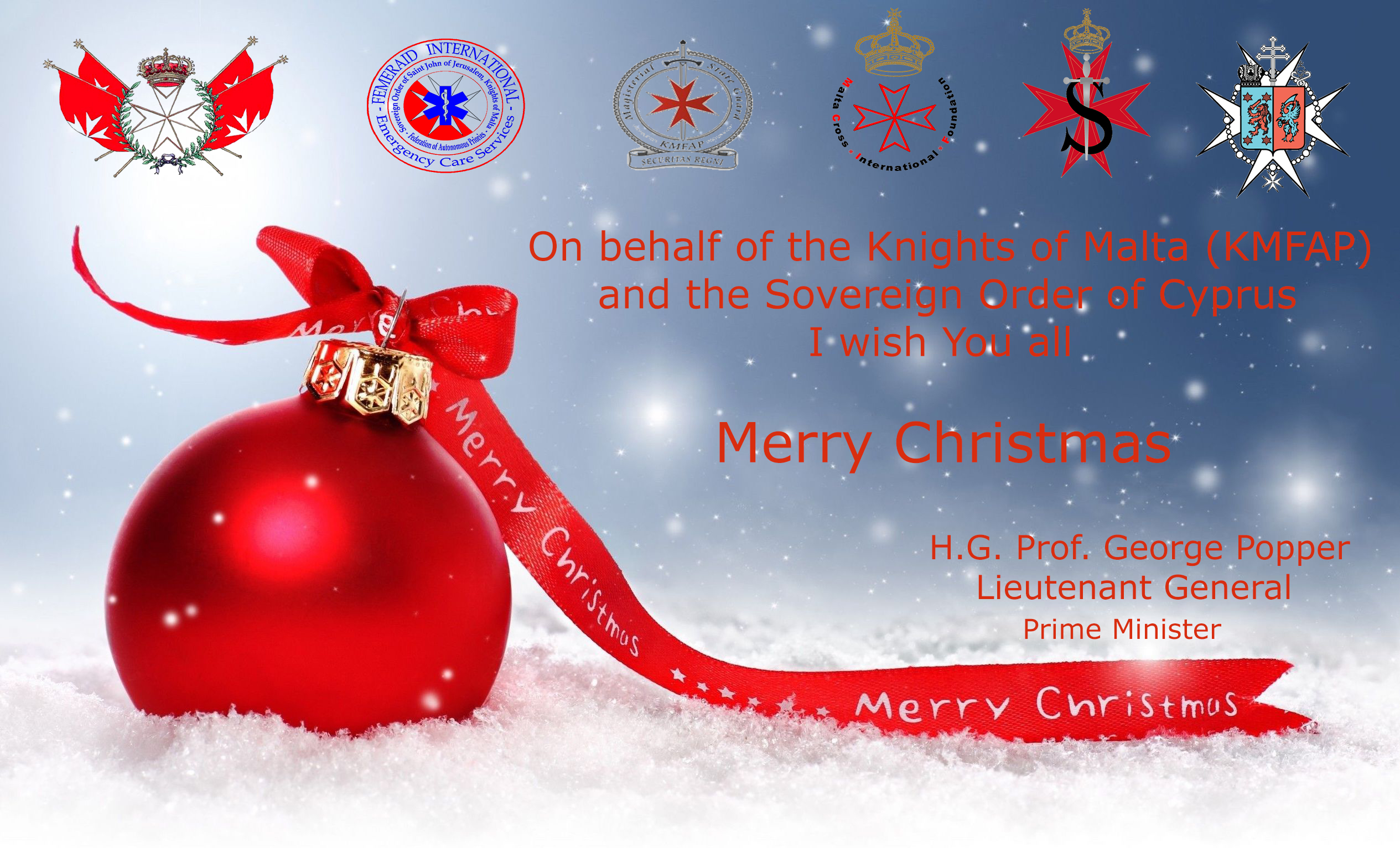 on behalf of the Sovereign Order of Saint John of Jerusalem, Knights of Malta, Federation of the Autonomous Priories (KMFAP), the Sovereign Order of Cyprus - Knights of Sword and Silence and all our partner organisations, I wish you and your beloved ones a Merry Christmas!
