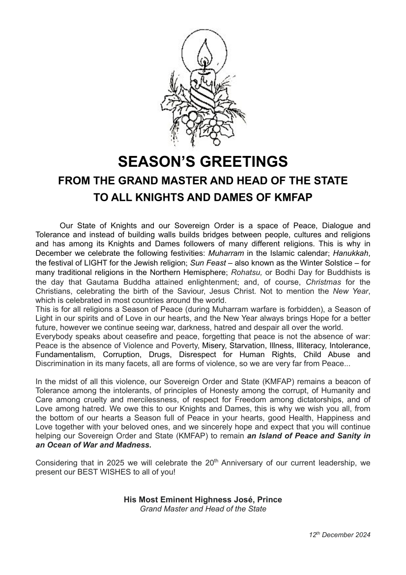 Season's Greetings from the Grand Master and Head of the State of KMFAP - 2024